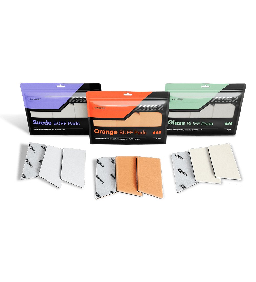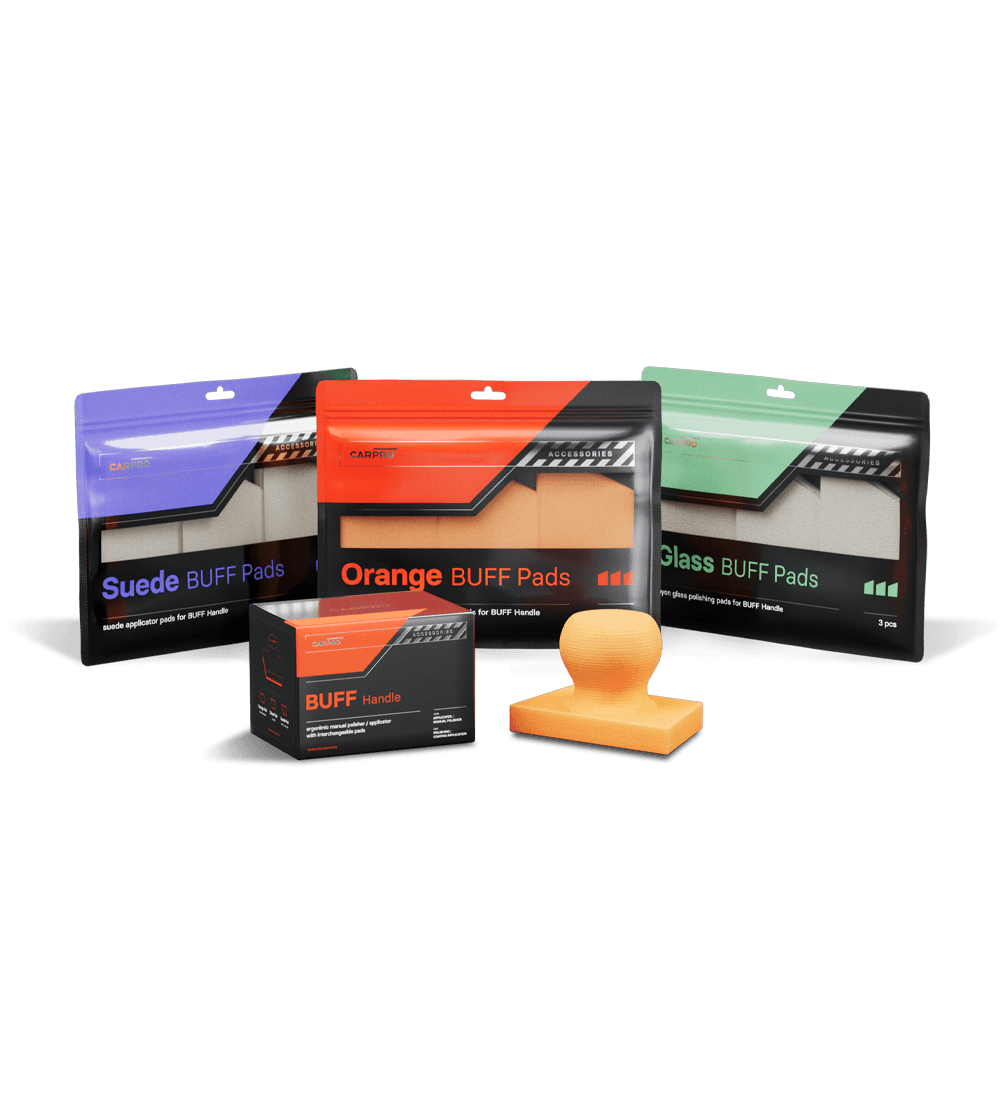 BUFF is the newest, extremely versatile addition to your detailing kit. Attach either of the three compatible pads to this ergonomic handle and BUFF away!